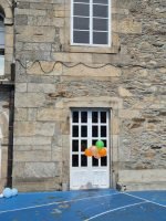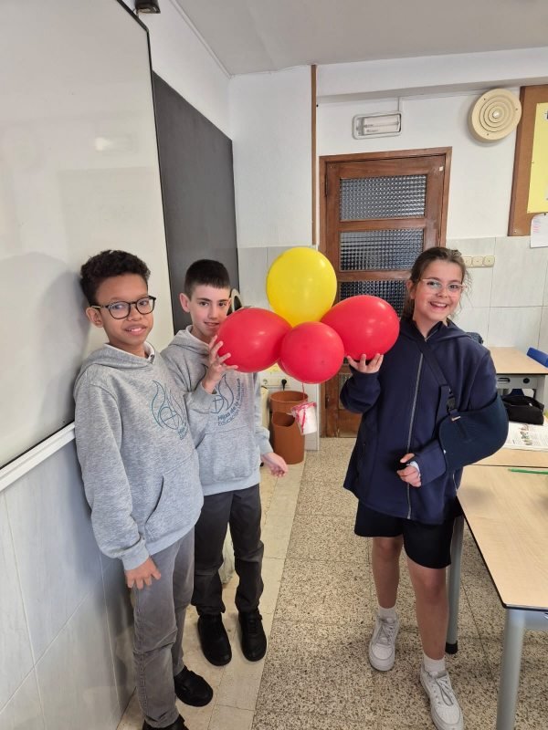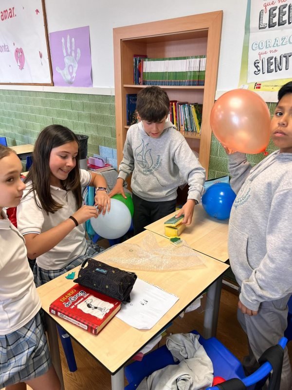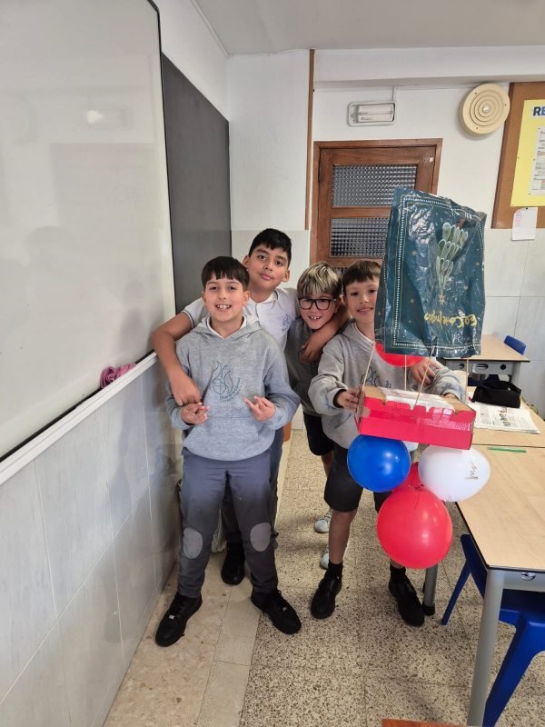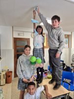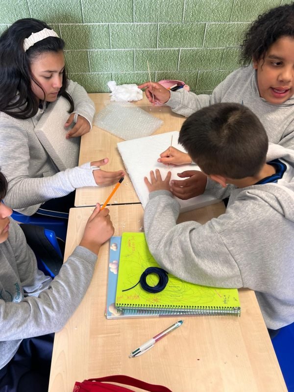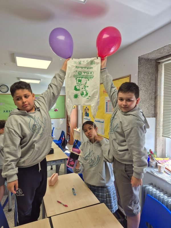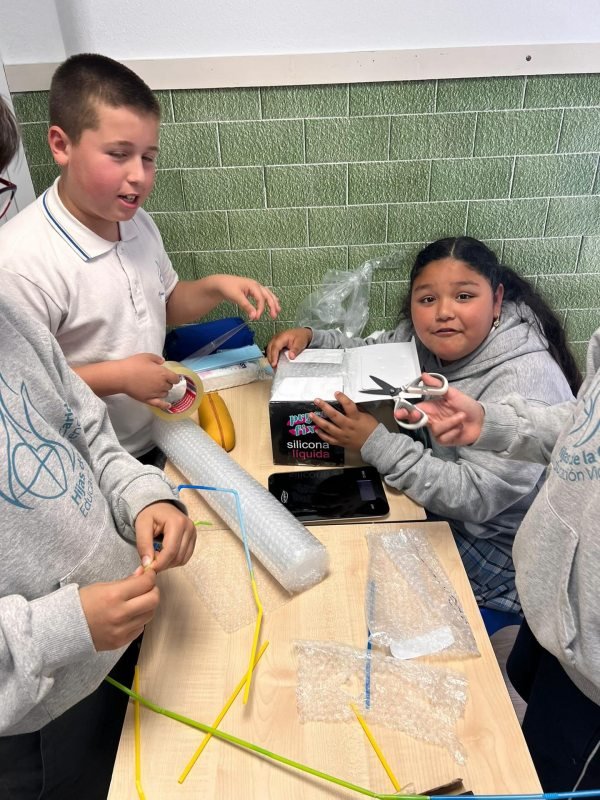 Os alumnos e alumnas de 5° de primaria levan unha semana sumerxidos na ciencia, deseñando un artefacto para protexer e manter intacto un ovo cru lanzado desde un segundo piso.