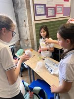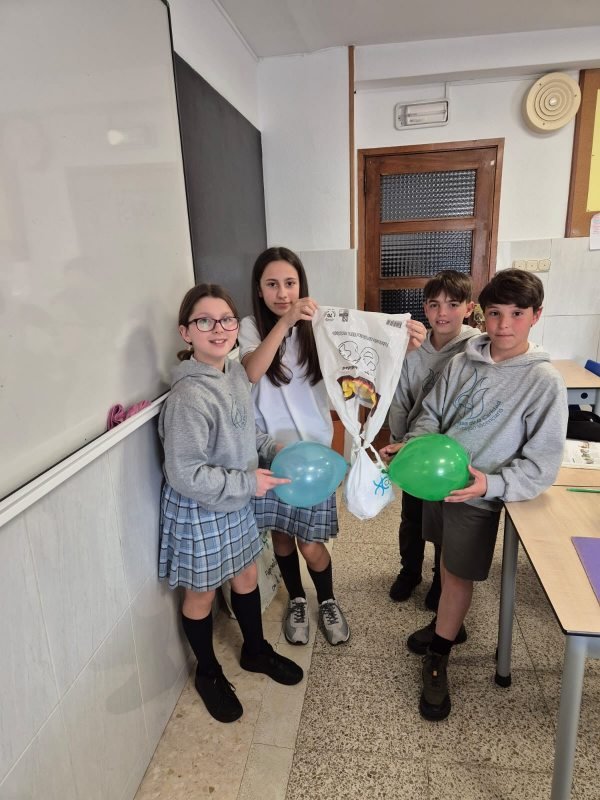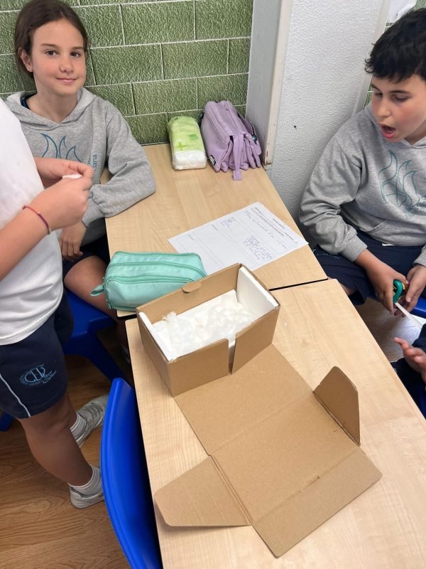 Os alumnos e alumnas de 5° de primaria levan unha semana sumerxidos na ciencia, deseñando un artefacto para protexer e manter intacto un ovo cru lanzado desde un segundo piso.