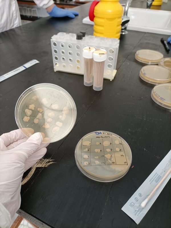 Sementamos os microorganismos das nosas mostras de solo en distintos medios de cultivo e aillamos moitos e moi variopintos tipos de colonias.