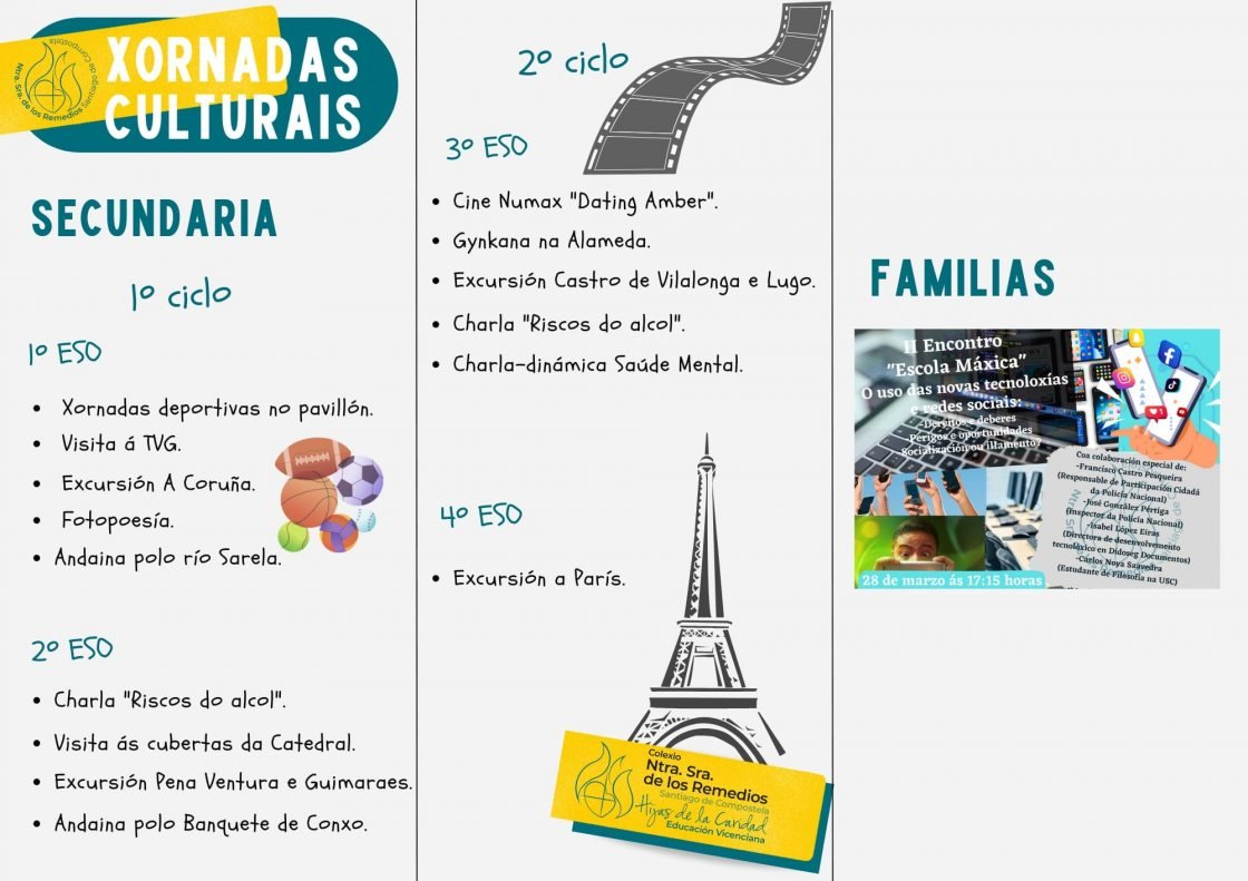 Nos próximos días comezaremos a Semana Cultural cunha gran variedade de actividades: concertos, obradoiros, roteiros, contacontos...cos que o noso alumnado aprenderá dun xeito máis lúdico fóra das aulas.