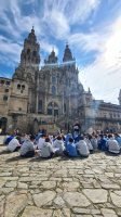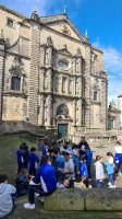 Comezamos saíndo por unha das sete portas antigas da muralla da cidade, a porta da Mámoa, pasamos xunto a torre do noso colexio vista dende fora, polo arco de Mazarelos, único que se conserva desas sete portas da cidade, imaxinamos os mercados antigos, vimos como medían os peixes, recordamos a Sampaio, falamos da lenda do cruceiro, pasamos xunto a porta do camiño francés, por onde entraban os reis e os peregrinos, recorremos parte da muralla, bordeamos o mosteiro de San Martín Pinario, recoñecemos as 4 portas da catedral e o seu estilo arquitectónico,…